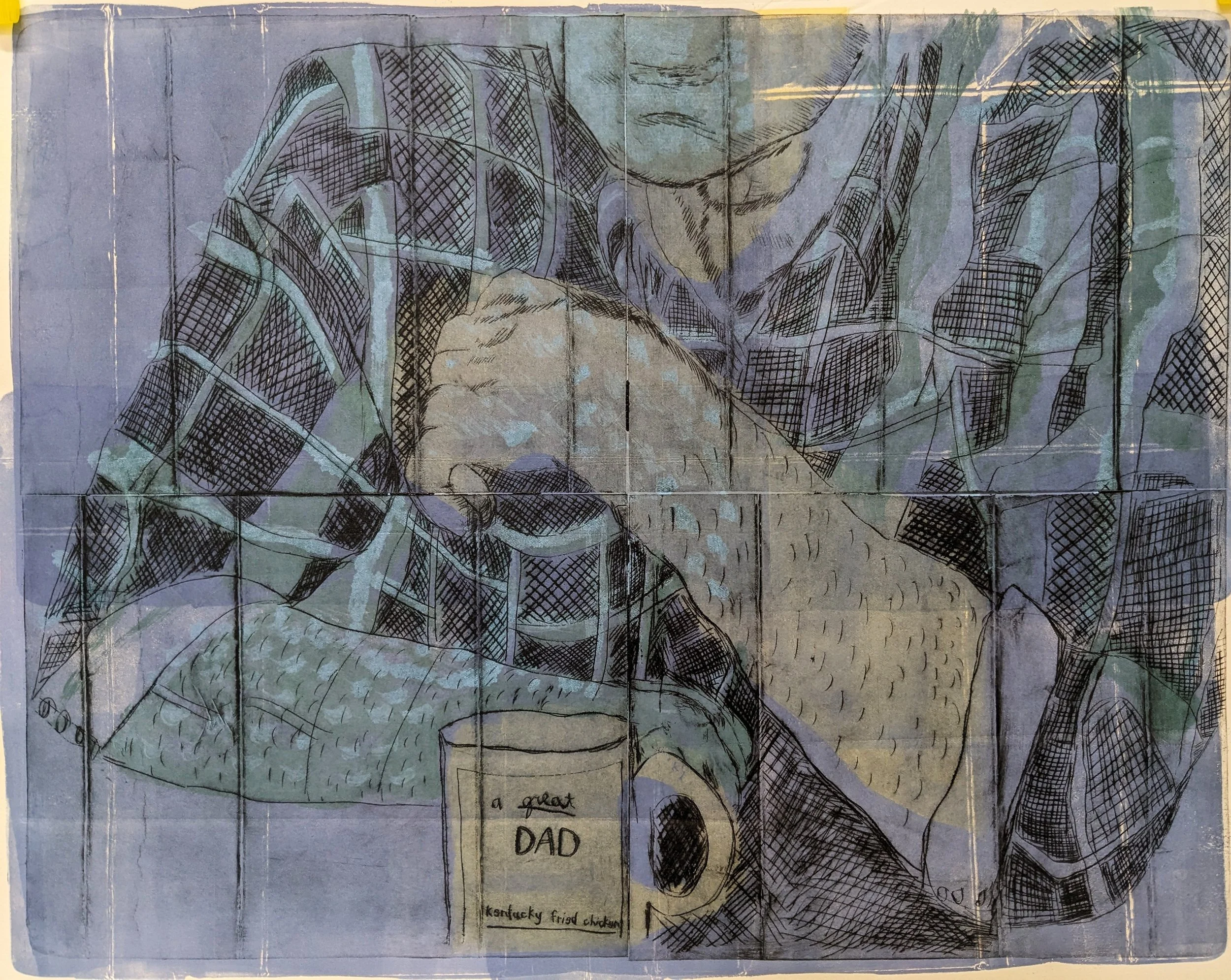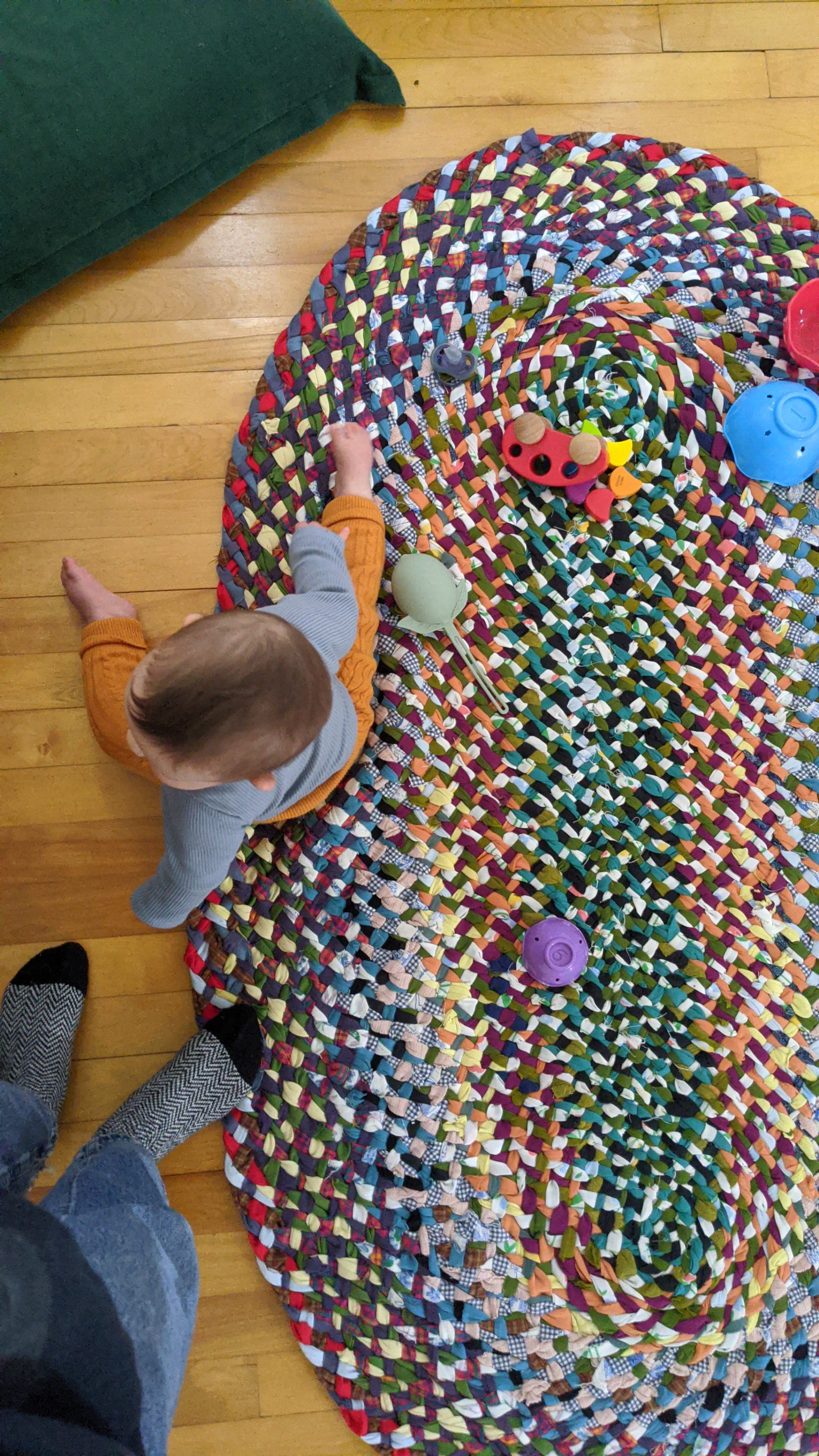 I began this rug hooking piece after the birth of my son in September 2024. It was meant to carry me through the post-partum year as a project to keep me connected to my art practise, despite all the changes ahead of me. I have so many feelings about motherhood, invisible labour, and duty to family that are layered into the meaning of this piece. The image is a tribute to my grandfather, and the work was created as an inheritance gift to my son. This piece is still in progress.