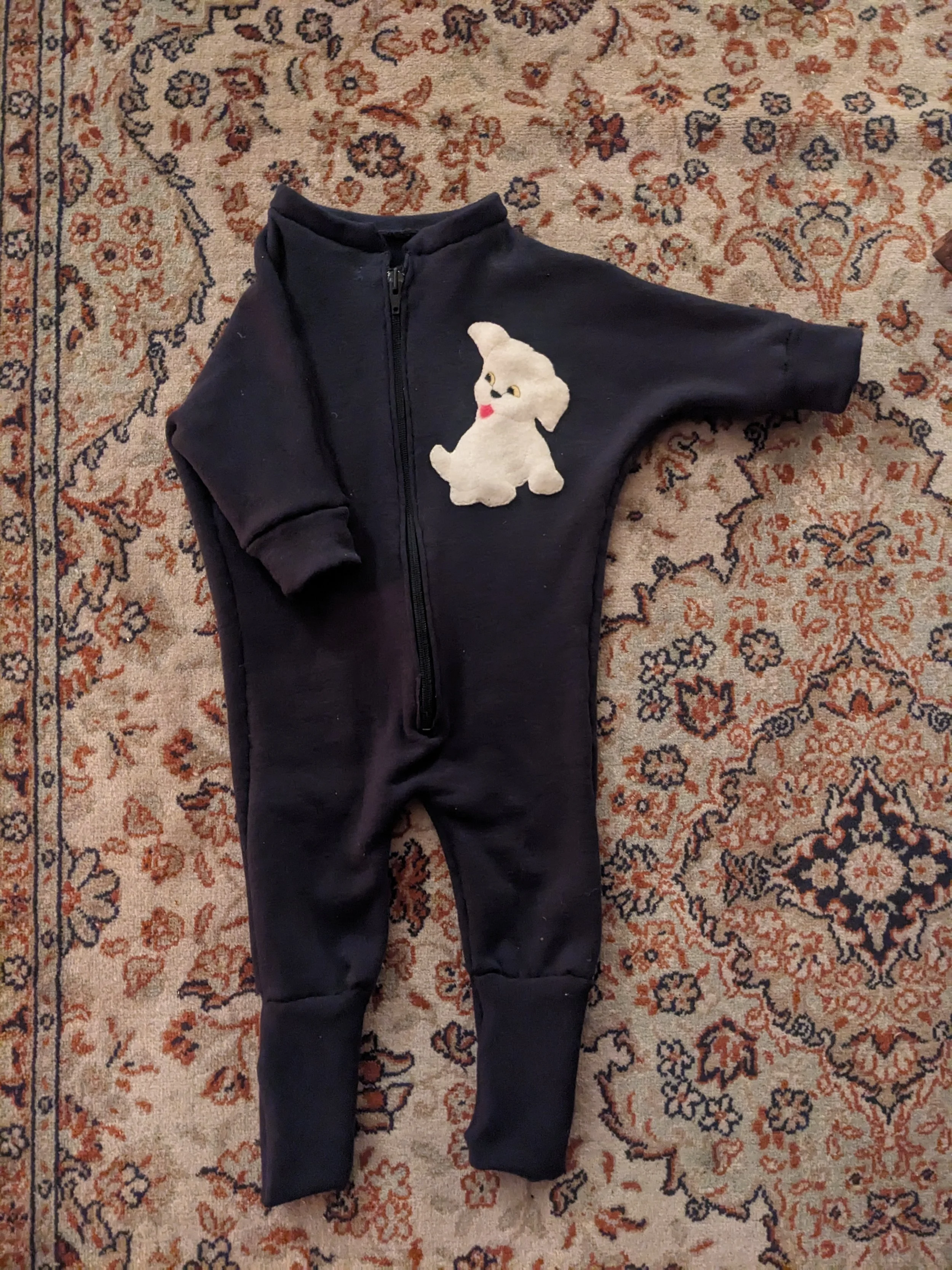 A free hand patterned jumpsuit, repurposed fabric from an old pair of sweatpants.