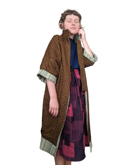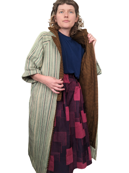 A REVERSIBLE COAT MADE FROM AN OLD BLANKET AND THIRFTED FABRIC FOR MY UPCOMING TRIP TO IRELAND. I FIND RIGHT BEFORE A TRIP I HAVE A BLOOM OF CREATIVITY BECAUSE MY IMAGINATION COMES ALIVE WITH ALL THE “WHAT IFS”. I OFTEN END UP MAKING NEW CLOTHES BECAUSE I HAVE ALL THESE IMAGINED SCENARIOS IN MY HEAD AND THEY HAVE A CERTAIN SET DESIGN, AND I ABSOLUTELY MUST HAVE THE COAT I IMAGINED FOR THE UNLIKELY WALK I WILL HAVE ON A MISTY MOOR.