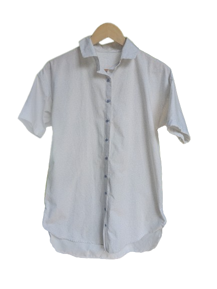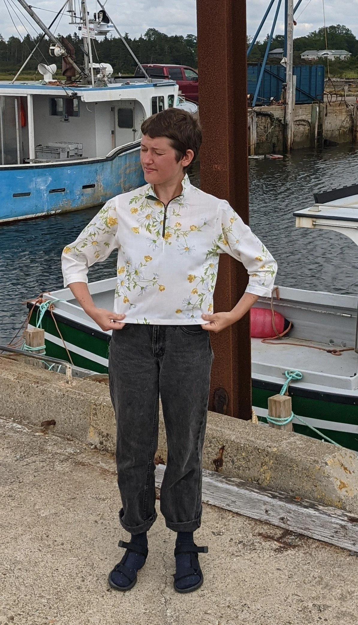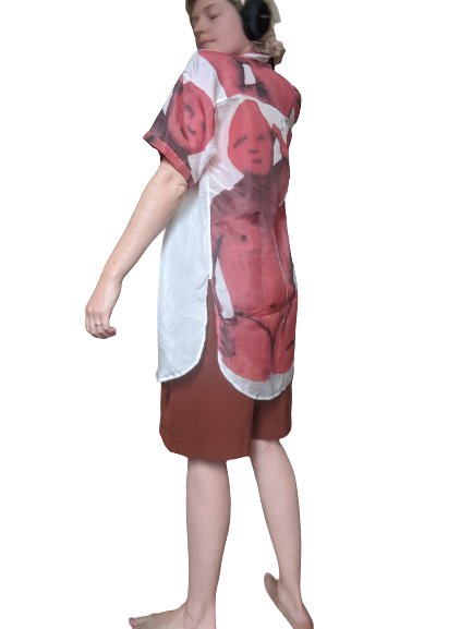 TWO PIECES MADE FROM THE SAME DRAWN DRESS SHIRT PATTER.N. THE ONE ON THE LEFT IS REPURPOSED SILK SCARVES, THE DESIGN IS FROM @MEIOW_MIX. THE SHIRT ON THE RIGHT IS MADE FROM CHILDHOOD BEDSHEET, IT’S HARD TO PICK UP THE DESIGN BUT IT’S VERY LIGHT BLUE AND WHITE PATTERNING. SO SUBTLE BUT IT IS WHAT ALWAYS DREW ME TO THAT FABRIC.
