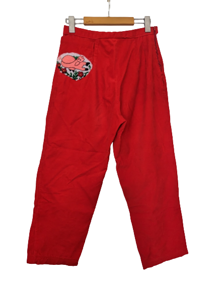 I FOUND THIS AMAZING SCRAP OF FABRIC WHEN THIRFTING BUT IT WAS SO SCRATCHY, I GOT SOME OLD FLANNEL AND LINED THE INSIDE SO NOW THEY ARE A PERFECT WINTER PANT. ONCE AGAIN IRELAND COUTURE, THESE ARE FOR WALKING ON A GRASSY CLIFF WITH A SLENDER RIDING BOOT AND A HAM SANDWICH.