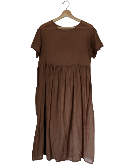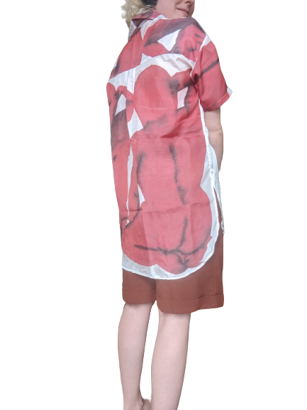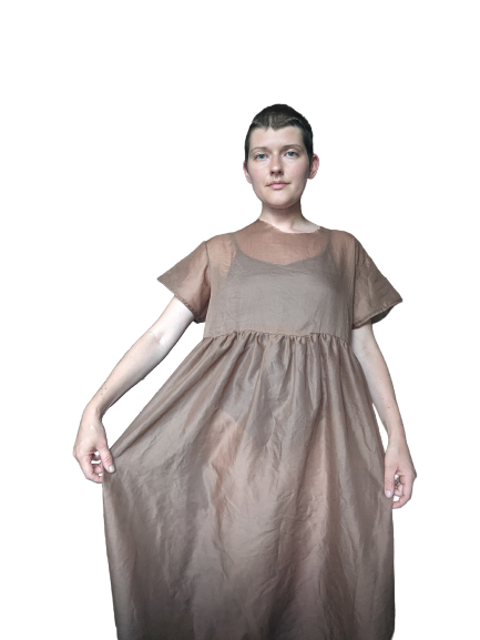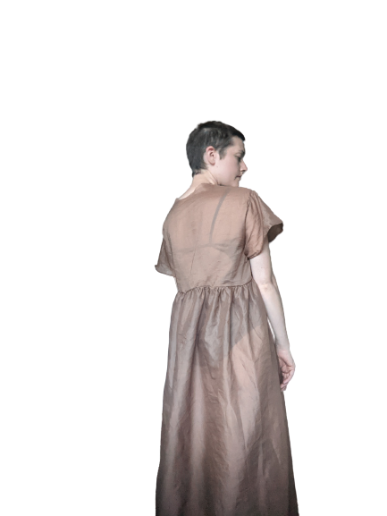 ANOTHER VARIATION ON “THE HOUSE DRESS”, THIS ONE MADE FROM SILK CHIFFON DYED WITH HIBISCUS FLOWERS AND BLACK TEA, A LINEN STRIP ADDED FOR COLOUR BLOCKING.