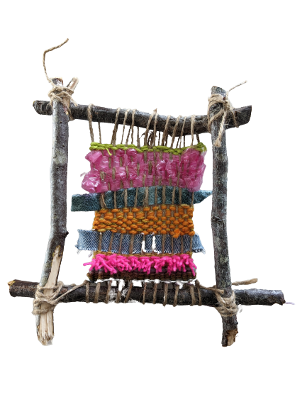 INTRO TO WEAVING WITH FOCUS ON REPURPOSING OF MATERIALS SUCH AS PLASTICS, FABRICS, AND OCEAN DEBRIS.